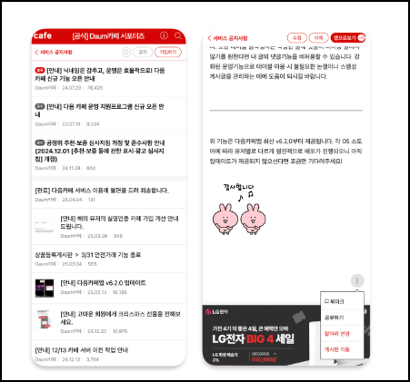 앱 설치 후 카카오 계정으로 로그인하면 앱 하단 메뉴에서 내카페 목록을 바로 확인할 수 있습니다. 새 게시글 작성 시 앱 알림을 받을 수 있어 중요한 카페 소식을 놓치지 않을 수 있습니다.
