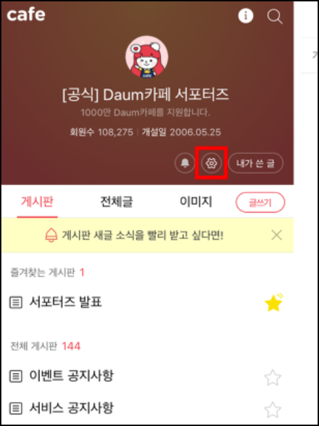 - 다음 카페 홈 상단 [내카페] 탭 클릭