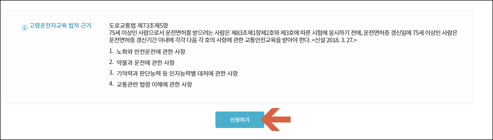 메인 화면 → [고령운전자 교육] 배너 클릭 → [수강신청] 버튼 클릭 → 주민등록번호 입력 후 교육 대상 여부 확인 → 신청 완료 - STEP 4. 강의 수강