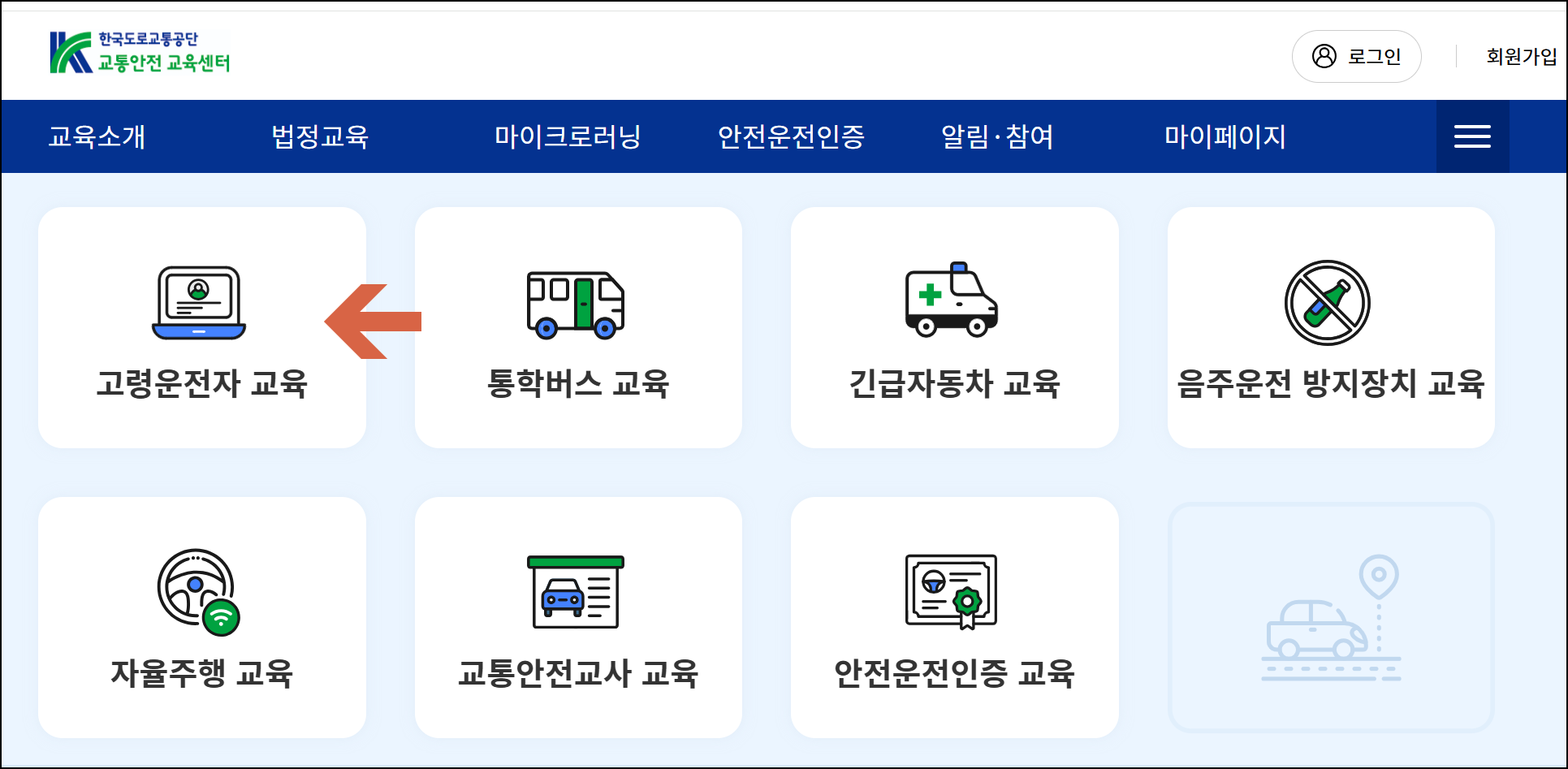 - STEP 2. [교통안전교육] → [고령운전자 교육] 클릭