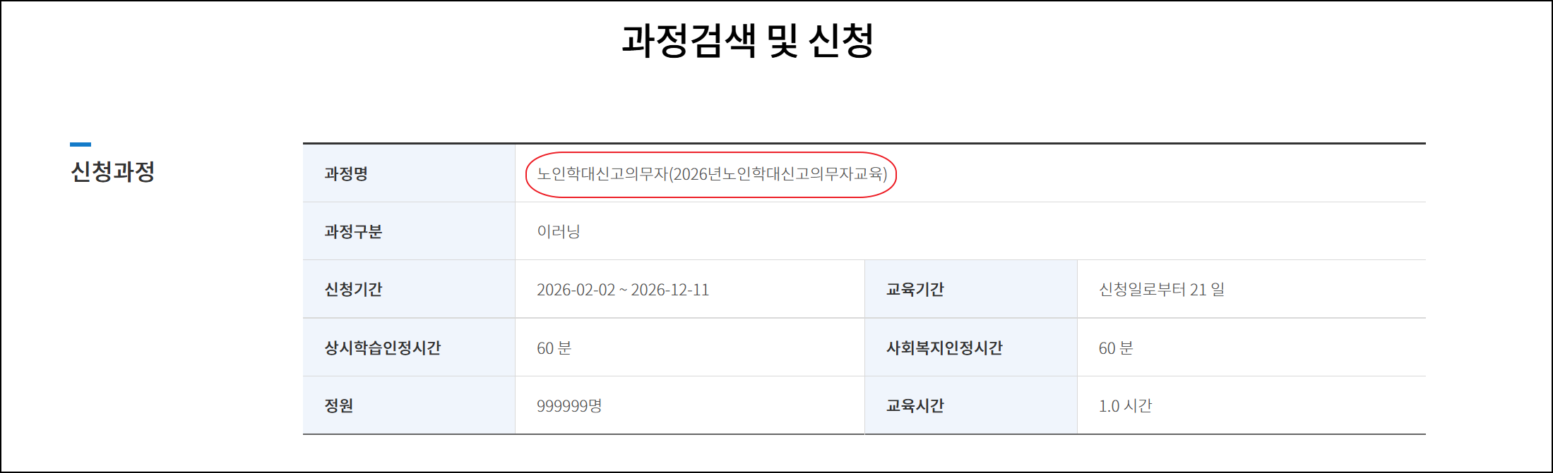 - 의무교육 카테고리에서 “노인학대 신고의무자 교육” 검색