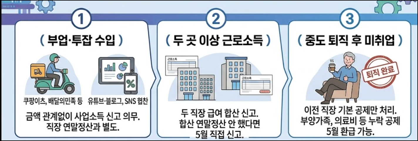 직장을 다니면 연말정산으로 세금 처리가 끝난다고 생각하기 쉽습니다. 하지만 아래 경우에 해당하면 직장인도 반드시 종합소득세를 신고해야 합니다.