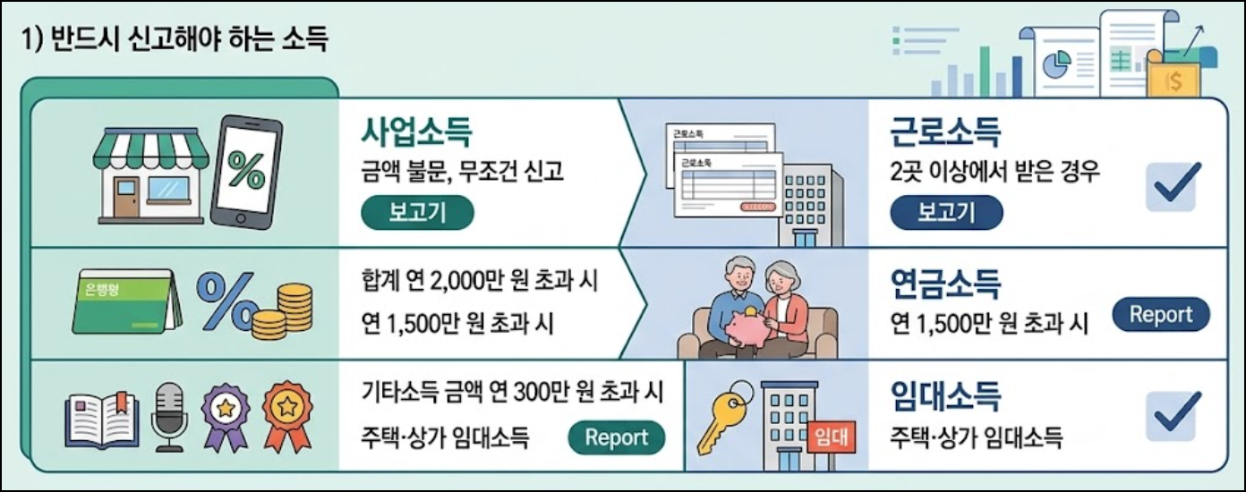 종합소득세 신고 대상은 소득 유형에 따라 기준이 다릅니다. 아래 표를 확인하세요.